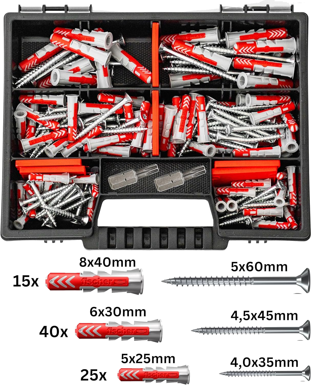Fischer DuoPower Set Dübel + Schrauben mit Bits, 162 Teiliges Dübelsortiment. Dübel in verschiedenen Größen - 25 Stück 5x25mm + 40 Stück 6x30mm + 15 Stück 8x40mm + Schrauben Universaldübel