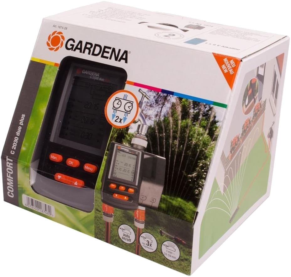 Beide Ausgänge können mit einem Sensor gesteuert werden. Die Bewässerungseinheit ist für einen Wasserhahn von 26,5 mm (G 3/4) und 33,5 mm (G1) bei Betriebsdrücken von 0,5-12 bar geeignet. Dieses Gerät benötigt 9 V Alkaline-Batterien (ca. 1 Jahr). Die integrierte Batterieladeanzeige zeigt an, dass die Batterie ausgetauscht werden muss. Die Batterie ist nicht enthalten.