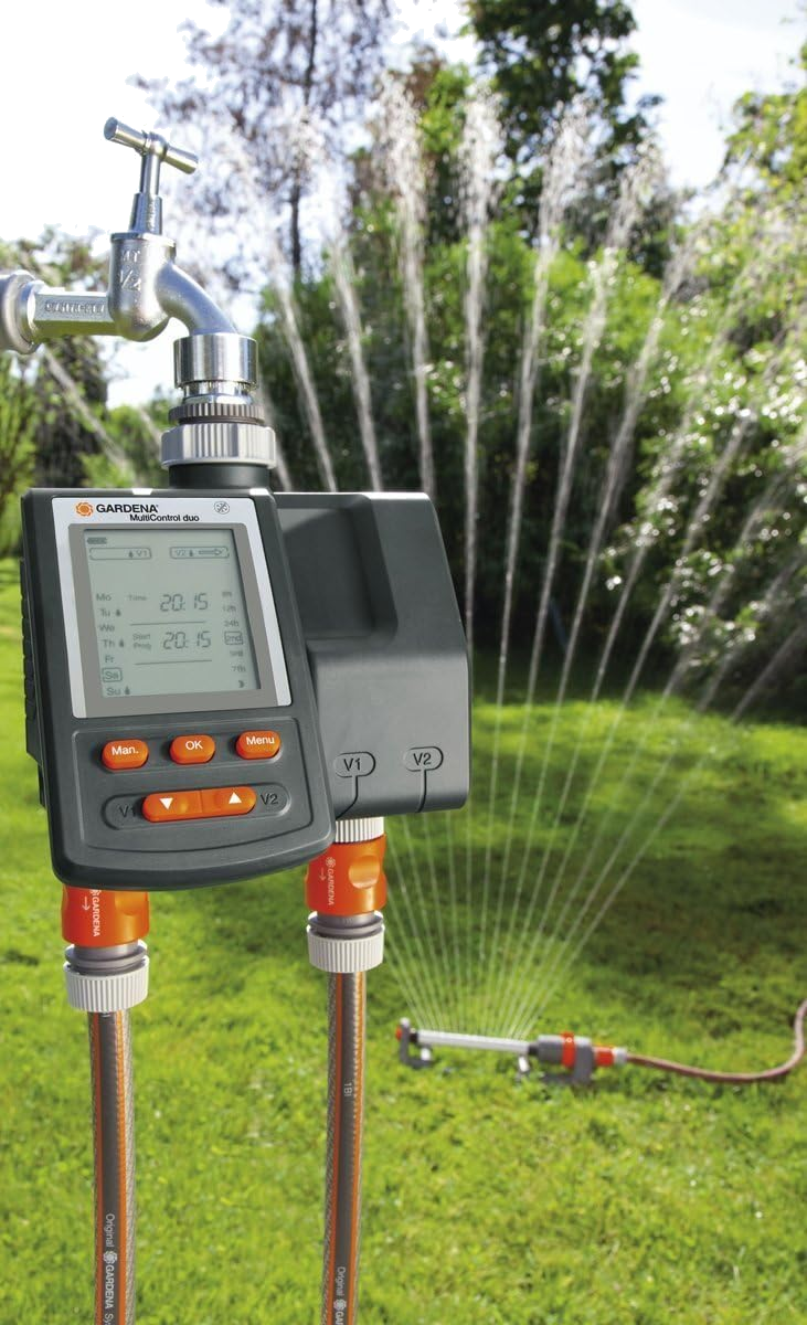 Das MultiControl duo Bewässerungssystem wird verwendet, um zwei unabhängige Gartenbereiche zu bewässern, wie den Rasen auf der Rückseite des Hauses und die Pflanzen in den Balkonkästen. Zwei Ausgänge können separat programmiert werden (Beginn der Beregnung, Dauer und Frequenz können ausgewählt werden).