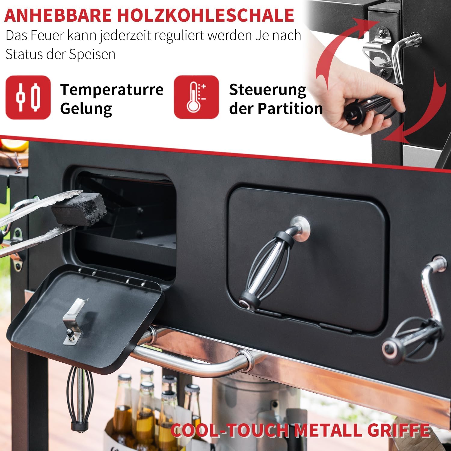 - 【Sicherer, einfacher Holzkohlezugang und hohe Qualität】Der Outdoor-Holzkohle-Smokergrill besteht aus hochwertigem Stahl. Hochtemperatur-Power-beschichtete Oberfläche Und mit 2 Holzkohle-Türen einzeln an der Vorderseite des Grills. Während des Kochens müssen Sie das Grillgut nicht bewegen oder die Grillroste wegnehmen. Öffnen Sie einfach die Tür und fügen Sie die Holzkohle mit 2 Kühlgriffen hinzu