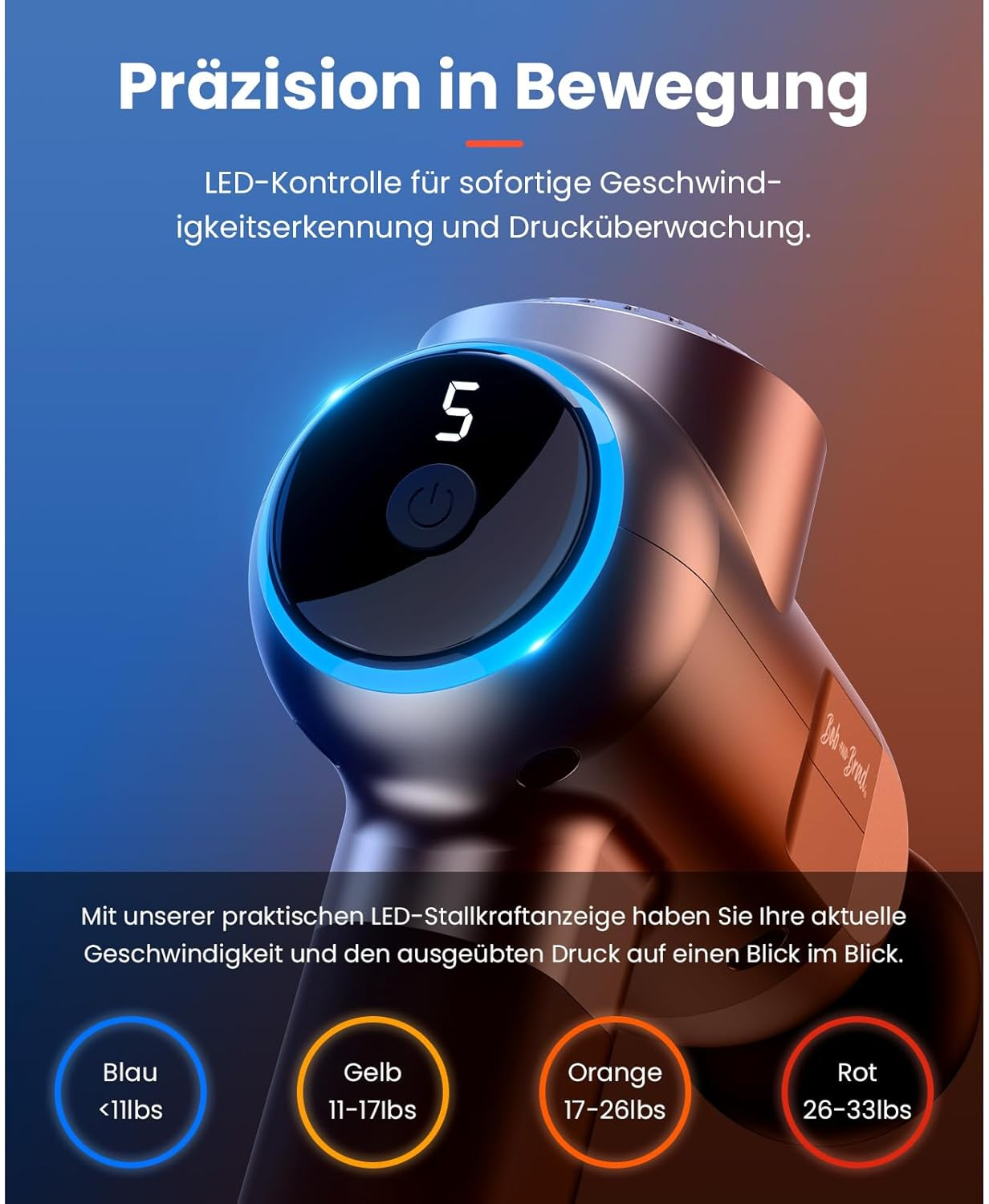 - Tiefenmuskeltherapie zur Schmerzlinderung: Die C2 Pro Massagepistole bietet eine professionelle Tiefenmuskeltherapie zur effektiven Schmerzlinderung. Mit einer kraftvollen Amplitude von 10 mm und einer Schlagkraft von 44 lbs dringt sie tief in die Muskeln ein, um Schmerzen zu lindern und Entspannung zu fördern. Mit 5 einstellbaren Geschwindigkeiten von 2000 bis 3200 U/min spricht es eine Vielzahl von Muskelbereichen an und ist damit ideal für Sportler, Fitness-Enthusiasten und alle, die eine fortgeschrittene Muskelerholung und Schmerzlinderung suchen.
