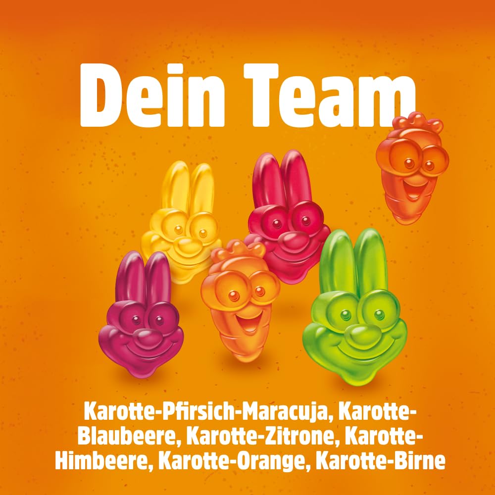 - Gemüse trifft Frucht: Himbeere-Karotte, Blaubeere-Karotte, Zitrone-Karotte, Birne-Karotte, Orange-Karotte und Pfirsich-Maracuja-Karotte – Das Fruchtgummi überzeugt in 6 Sorten