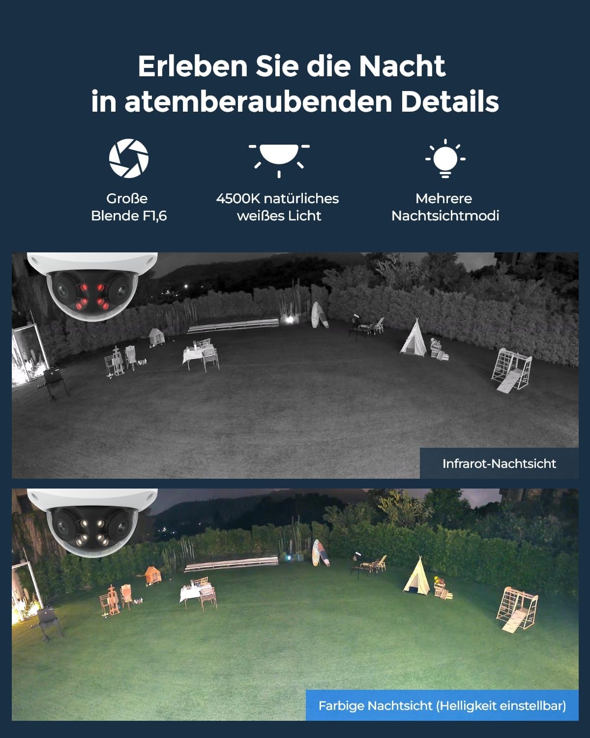 - MEHRERE NACHTSICHTMODI & FLEXIBLE ANPASSUNGSMÖGLICHKEITEN: Wechseln Sie frei zwischen Infrarot-Nachtsicht- und Farb-Nachtsichtmodi und konfigurieren Sie die bewegungsaktivierte oder zeitgesteuerte Aktivierung der Spotlights und passen Sie die Helligkeit an. Mit einer größeren F1.6-Blende bietet diese Kamera eine verbesserte Nachtsichtleistung bei schlechten Lichtverhältnissen.