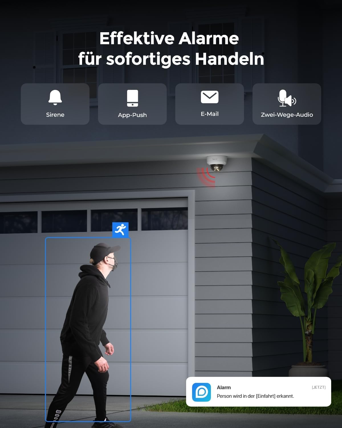 - KI-ERKENNUNG & BEWEGUNGSVERFOLGUNG: Duo 3V PoE ermöglicht Echtzeitwarnungen für erkannte Personen, Fahrzeuge und Tiere sowie anpassbare Erkennungszonen und Alarmzeitpläne. Ausgestattet mit der bahnbrechenden Bewegungsverfolgung-Technologie (Ohne PT-Funktion), spart diese Kamera Ihnen viel Zeit ein, indem sie ein Bild mit einer Zusammenfassung aller Bewegungen von Zielen innerhalb von 15 Sekunden an Ihre Reolink App oder E-Mail sendet. Sie brauchen keine Videos mehr herunterzuladen, um die Ereignisse zu überprüfen.