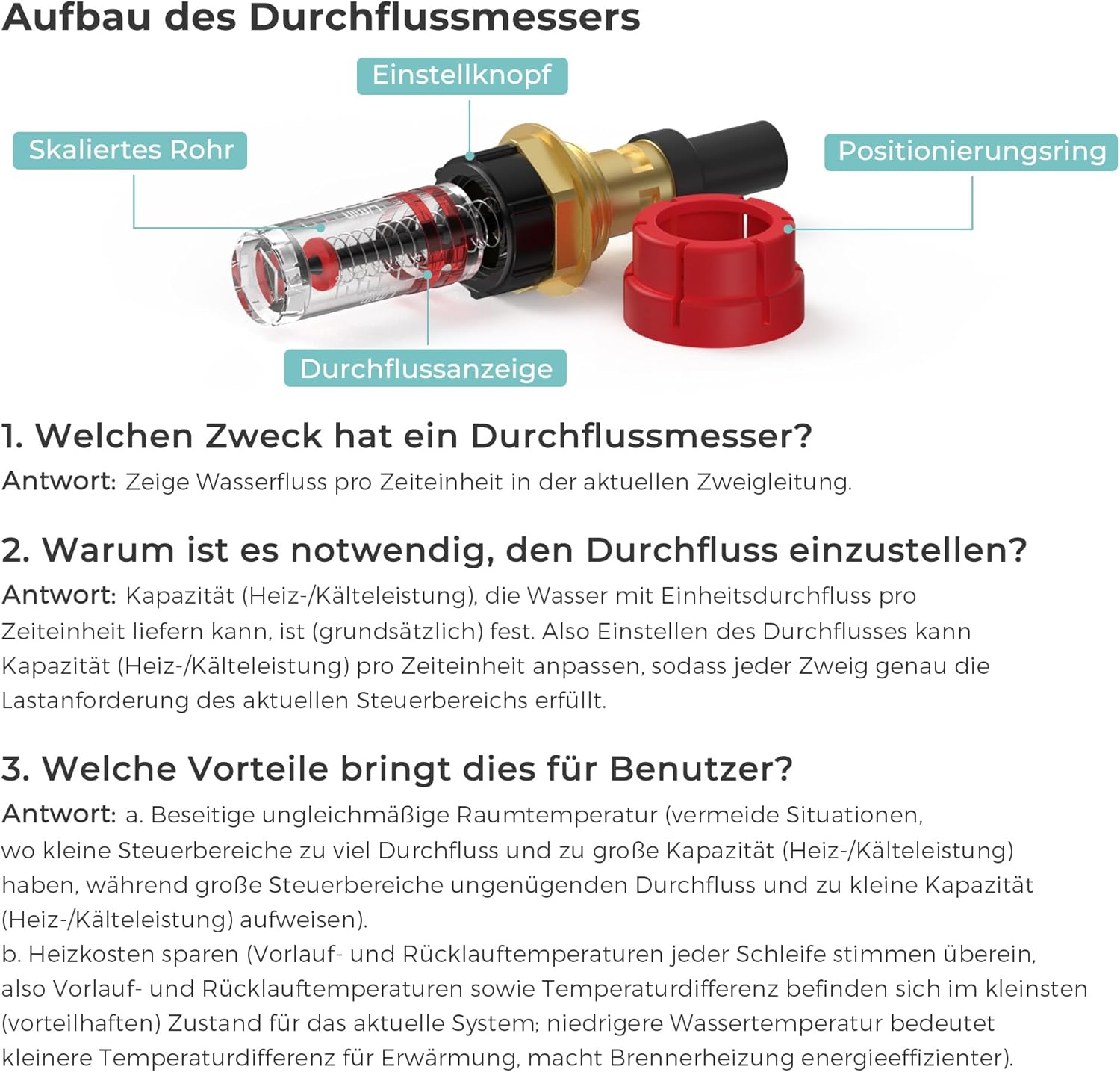 - [Funktion]Der Heizverteiler verteilt das Heizwasser gleichmäßig auf alle Kreisläufe. Er reguliert den Durchfluss präzise, ermöglicht Absperrung, zeigt die Temperatur an und entlüftet das System. Passend für verschiedene Wärmequellen wie Gaskessel, Luft- oder Erdwärmepumpen.Wir empfehlen, einen Heizkreis üblicherweise für einen Bereich von 15–20 m² auszulegen