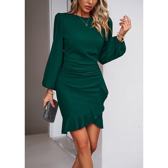 Haibang Damen Lange Ärmel Bodycon Mini Kleid Gerüschte Puffärmel Rüschensaum Rundhalsausschnitt Cocktail Party Arbeit Büro Kleid