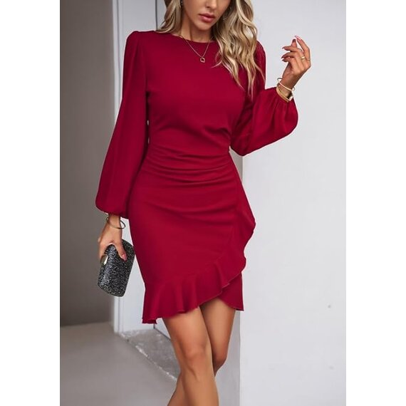 Haibang Damen Lange Ärmel Bodycon Mini Kleid Gerüschte Puffärmel Rüschensaum Rundhalsausschnitt Cocktail Party Arbeit Büro Kleid