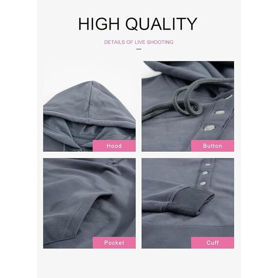 • Der Hoodie für Damen besticht durch sein stilvolles Waffelstrickmuster, den Knopf-V-Ausschnitt und die verstellbare Kapuze, die ihm einen schicken Look verleihen.