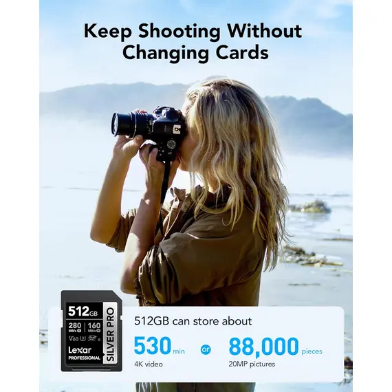 Lexar SILVER PRO SD Karte 512GB, UHS-II SD Speicherkarte, V60, U3, C10, bis zu 280MB/s Lesen, 160MB/s Schreiben, SDXC-Karte für DSLR/Kamera/Fotografen/Videofilmer/Enthusiasten (LSDSIPR512G-BNNAA)