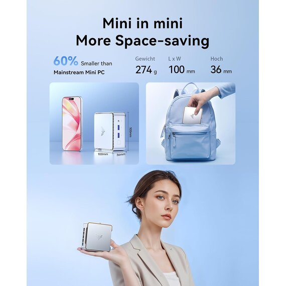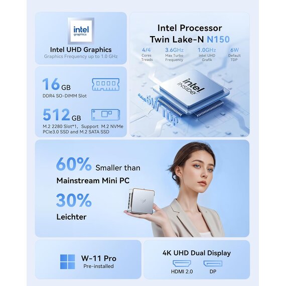 Einfach zu erlernen, einfach einzurichten. Der NiPoGi Mini-PC ist klein und exquisit und kann jederzeit in einer Tasche verstaut und mitgenommen werden, ideal für Geschäftsreisen. NiPoGi E2 umfasst 1x N150 Mini-PC, 1x Netzteil, 1x VESA-Halterung, 1x Benutzerhandbuch, 1xHDMI-Kabel, 1 Jahr hochwertigen Kundendienst und einen professionellen Kundendienst rund um die Uhr. › Weitere Produktdetails