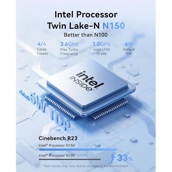 NiPoGi E2 mini pc ist mit dem neuesten Ιntel Twin Lake N150-Prozessor (bis zu 3,60 GHz, 4C/4T) aus dem Jahr 2025. Als aktualisierte Version der CPU-N100 hat er einen geringen Stromverbrauch von nur 6 W, was sehr energiesparend ist. Die Gesamtleistung der CPU-N150 wurde um 6–10 % verbessert, und die GPU wurde um 27 % verbessert, was Ihnen ein reibungsloseres und effizienteres Betriebserlebnis bietet. Er eignet sich sehr gut für den täglichen Büro und Heimgebrauch.