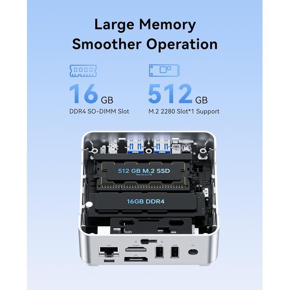 Mit 16 GB DDR4 RAM und 512 GB M.2 2280 SSD-Speicher können Sie problemlos zwischen mehreren Anwendungen wechseln, die Ausführung läuft reibungsloser und ohne Verzögerungen. Die integrierte 512 GB M.2 SSD sorgt dafür, dass Sie mehrere wichtige Dateien schnell speichern und die Startzeit verkürzen können. Unterstützt den Austausch von M.2 NVMe PCIe3.0 SSD oder M.2 SATA SSD, bis zu 2 TB. Sehr gut geeignet für den Büro- und Alltagsgebrauch.