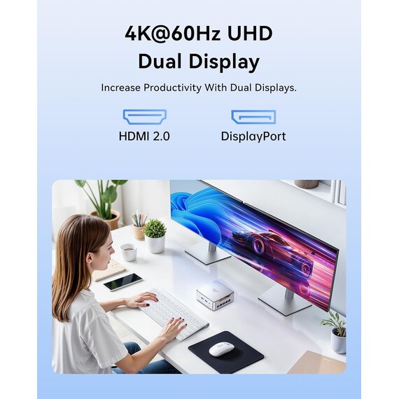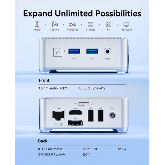 Der E2-Mikro-PC hat ein elegantes silbernes Gehäuse mit einem Flügellogo und Die Größe beträgt nur 10 x 10 x 3,6 cm, was 60 % kleiner und 30 % leichter ist als andere Mini-PCs auf dem Markt. Die Form des E2 wurde neu verbessert, was die Wärmeableitung verbessert und einen kontinuierlichen und stabilen Betrieb des Mini-PCs ermöglicht. W-11 Pro Vorinstalliertes Betriebssystem und unterstützt Linux, Ubuntu, Auto Power On, Wake On LAN und RTC Wake. HDMI 2.0 + PD-Ausgang, 4K@60Hz Dual-Displays】Der N150 Mini-PC ist mit integrierter 1,0-GHz-UHD-Grafik, 1x HDMI 2.0 und 1x DP-Videoausgang ausgestattet, unterstützt 4K-UHD-Dual-Display, was die Workflow-Effizienz verbessern und Ihnen ein hervorragendes visuelles 4K-UHD-Fest bieten kann. Geeignet für visuelle Heimunterhaltung, digitale Sicherheit und Überwachung, digitale Beschilderung, Mediencenter, Konferenzraum usw. Ausgestattet mit einer VESA-Halterung können Sie ihn überall installieren.