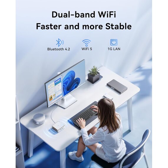 Der Mini-PC ist mit 2,4G + 5G Dualband-WiFi 5 und bietet Ihnen ein stärkeres und stabileres WLAN-Signal, das einen reibungslosen Betrieb von Online-Diensten, Online-Shopping, Videos und anderen Online-Arbeiten gewährleistet. Mit Bluetooth 4.2 können Sie mehrere Geräte drahtlos verbinden. Gigabit-Ethernet-Anschluss bietet sicheren und schnellen Internetzugang für große Dateidownloads, stabile Online-Gruppentreffen, industrielle und kommerzielle Anwendungen.