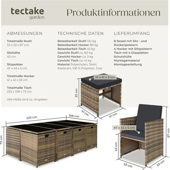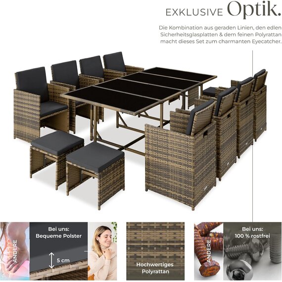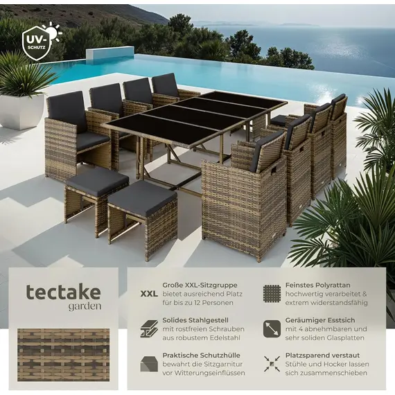 Gartenlounge Set, Polyrattan Gartenmöbel Set, 8+4+1 Sitzgruppe, 8 Stühle 4 Hocker 1 Tisch, Balkon Möbel als Würfel verstaubar, für Garten, Balkon, Terrasse - Natur/dunkelgrau
