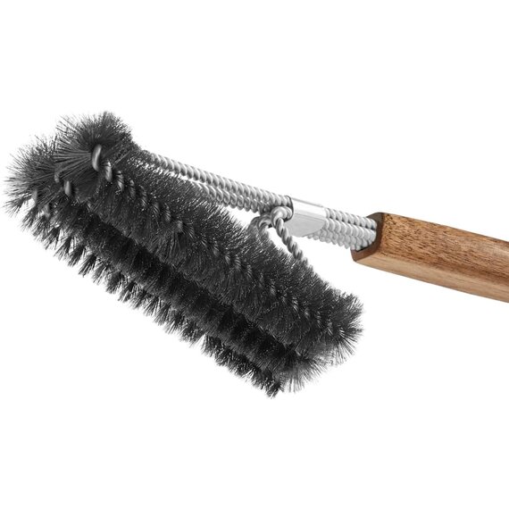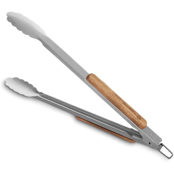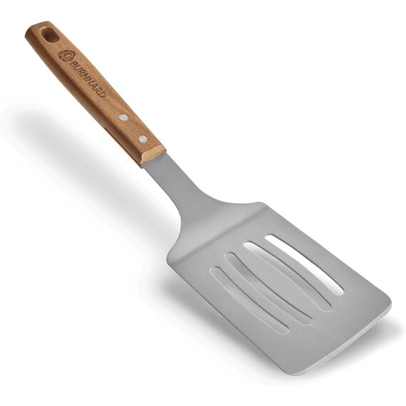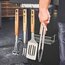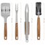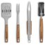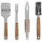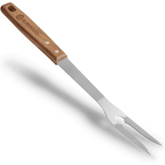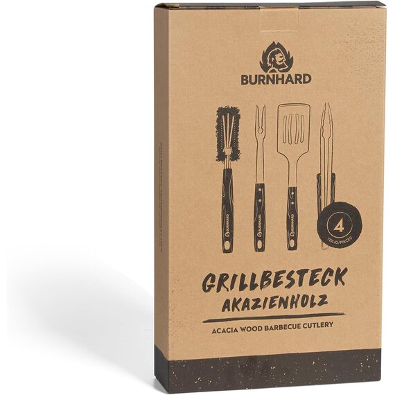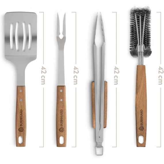 BURNHARD Grillbesteck-Set 4-TLG. 42 cm, Akazienholz Edelstahl, Grillzubehör mit Grillzange, Grillwender, Fleischgabel und Grillbürste mit extra-Langen Holzgriffen und Aufhänge-Ösen