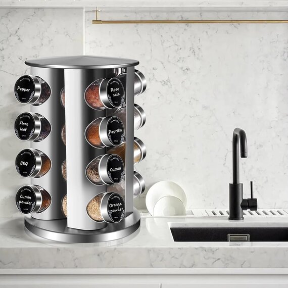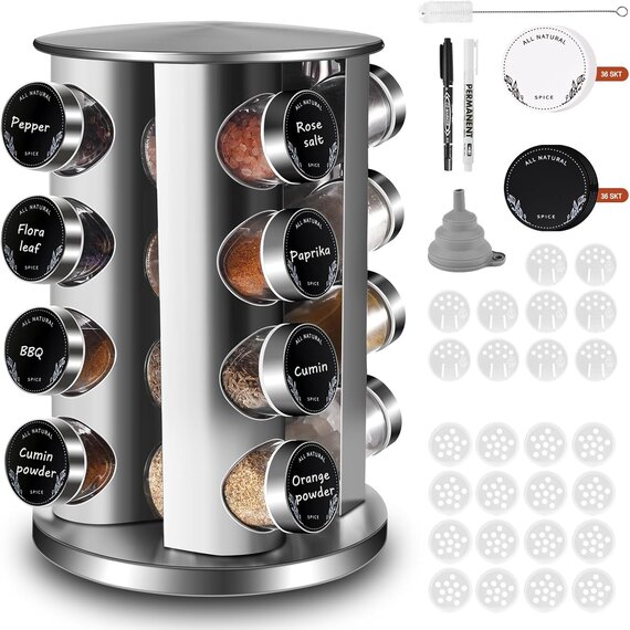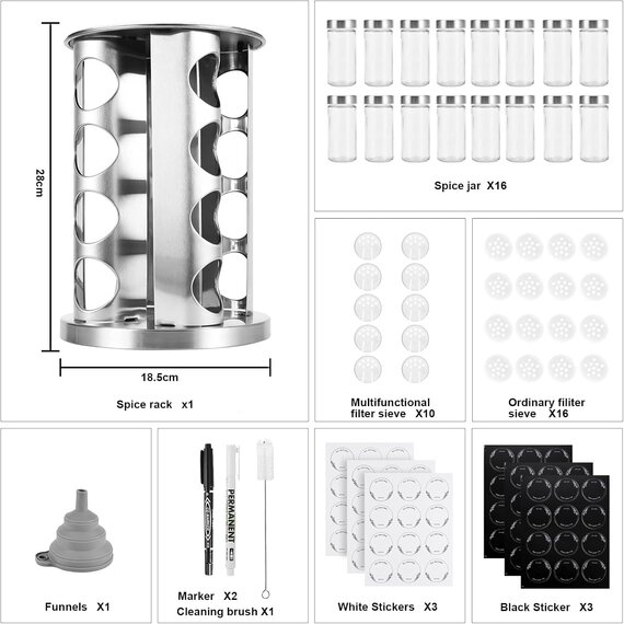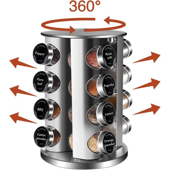 FNLLC Rundes Gewürzregal Mit 16 Gewürzgläser Rund,360° Drehbarer Edelstahl Gewürzkarussell,Gewürz Organizer,Gewürzständer Stehend,Gewürzdosen Mit Streueinsatz,Gewürzglas