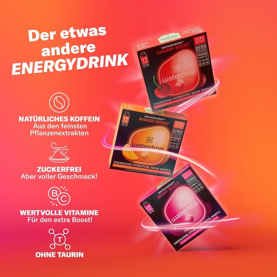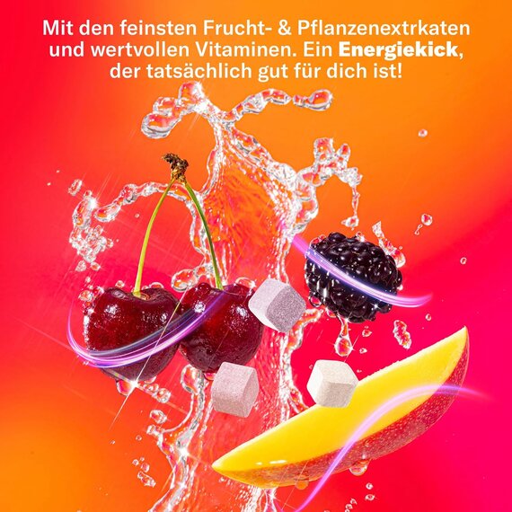 BERRY BOOST: Säuerungsmittel: Citronensäure; Säureregulatoren: Natriumcarbonate, Kaliumcarbonate; natürliches Aroma, Kolanussextrakt, Koffein, Brombeerfruchtpulver, Süßungsmittel: Sucralose; Vitamin C, Säuerungsmittel: Äpfelsäure; Säureregulator: Calciumcarbonat; Farbstoff: Anthocyane; Niacin, Pantothensäure, Vitamin B6, Thiamin, Folsäure, Vitamin B12. BERRY BOOST: Säuerungsmittel: Citronensäure; Säureregulatoren: Natriumcarbonate, Kaliumcarbonate; natürliches Aroma, Kolanussextrakt, Koffein, Brombeerfruchtpulver, Süßungsmittel: Sucralose; Vitamin C, Säuerungsmittel: Äpfelsäure; Säureregulator: Calciumcarbonat; Farbstoff: Anthocyane; Niacin, Pantothensäure, Vitamin B6, Thiamin, Folsäure, Vitamin B12 Erhöhter Koffeingehalt. Für Kinder und schwangere oder stillende Frauen nicht empfohlen (18 mg/100 ml). In moderaten Mengen konsumieren. CHERRY BOOST: Säuerungsmittel: Citronensäure; Säureregulatoren: Natriumcarbonate, Kaliumcarbonate; färbendes Konzentrat aus Rote Bete, Koffein, Guaranaextrakt, natürliches Aroma, Süßungsmittel: Sucralose; Vitamin C, Säuerungsmittel: Äpfelsäure; Sauerkirschpulver, Säureregulator: Calciumcarbonat; Ginsengextrakt, Malvenextrakt, Niacin, Pantothensäure, Vitamin B6, Thiamin, Farbstoff: Beta-Carotin; Folsäure, Vitamin B12 Erhöhter Koffeingehalt. Für Kinder und schwangere oder stillende Frauen nicht empfohlen (18 mg/100 ml). In moderaten Mengen konsumieren. MANGO BOOST: Säuerungsmittel: Citronensäure; Mangofruchtpulver, Säureregulatoren: Natriumcarbonate, Kaliumcarbonate; Auszüge aus getrockneten Blättern von Ilex guayusa, Koffein, Süßungsmittel: Sucralose; Vitamin C, Säuerungsmittel; Äpfelsäure; Zitrusfasern, natürliches Aroma, Säureregulator: Calciumcarbonat; Niacin, Pantothensäure, Vitamin B6, Thiamin, Folsäure, Vitamin B12 Erhöhter Koffeingehalt. Für Kinder und schwangere oder stillende Frauen nicht empfohlen (18 mg/100 ml). In moderaten Mengen konsumieren.