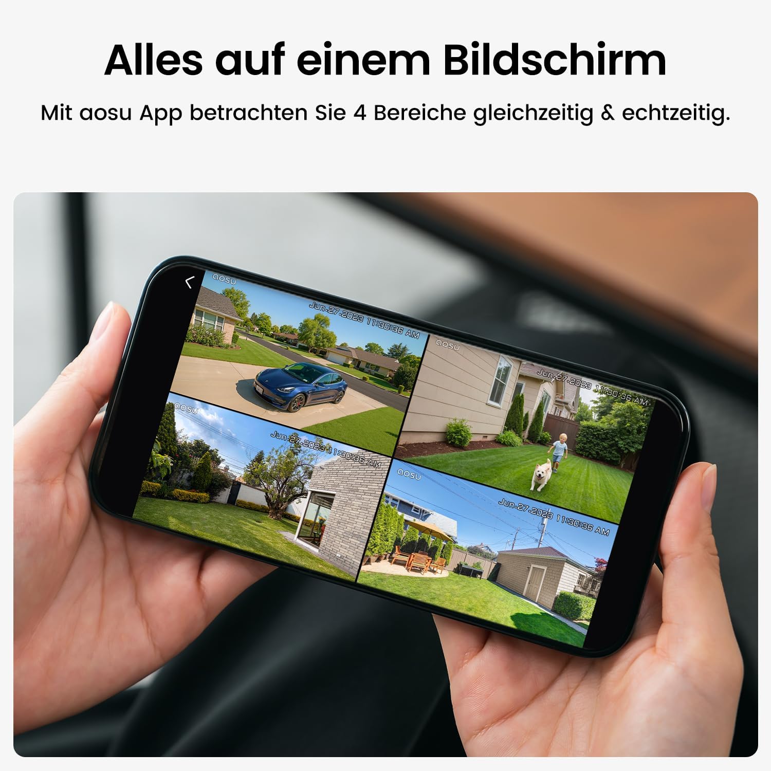 - 【aosuSmart Experience】- 1.Kamera-zu-Kamera-Verfolgung: Verknüpfen Sie automatisch Videos von Ereignissen im gleichen Zeitraum für einfache Überprüfungen. 2. Überprüfen Sie 4 Live-Streams gleichzeitig auf demselben Mobiltelefon. 3. nur 1 Klick, können Sie alle 4 aosu wlan kamera outdoor kabellos.