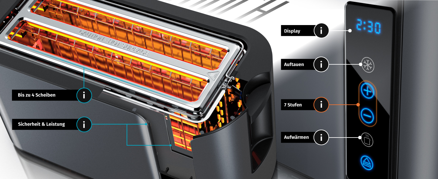 - FUNKTIONEN: Defrost / Reheat / Cancel / + / - mit Kontrollleuchte (LED) / Memory - Funktion / Countdownzeit | Bräunungsgrade 1-7 | Touch-Display mit Restzeitanzeige und gewählter Toaststufe | integrierter Brötchenaufsatz | 5 Sensortasten | Krümelschublade | Kabelaufwicklung | Anti-Rutsch-Füße | Doppelwandgehäuse