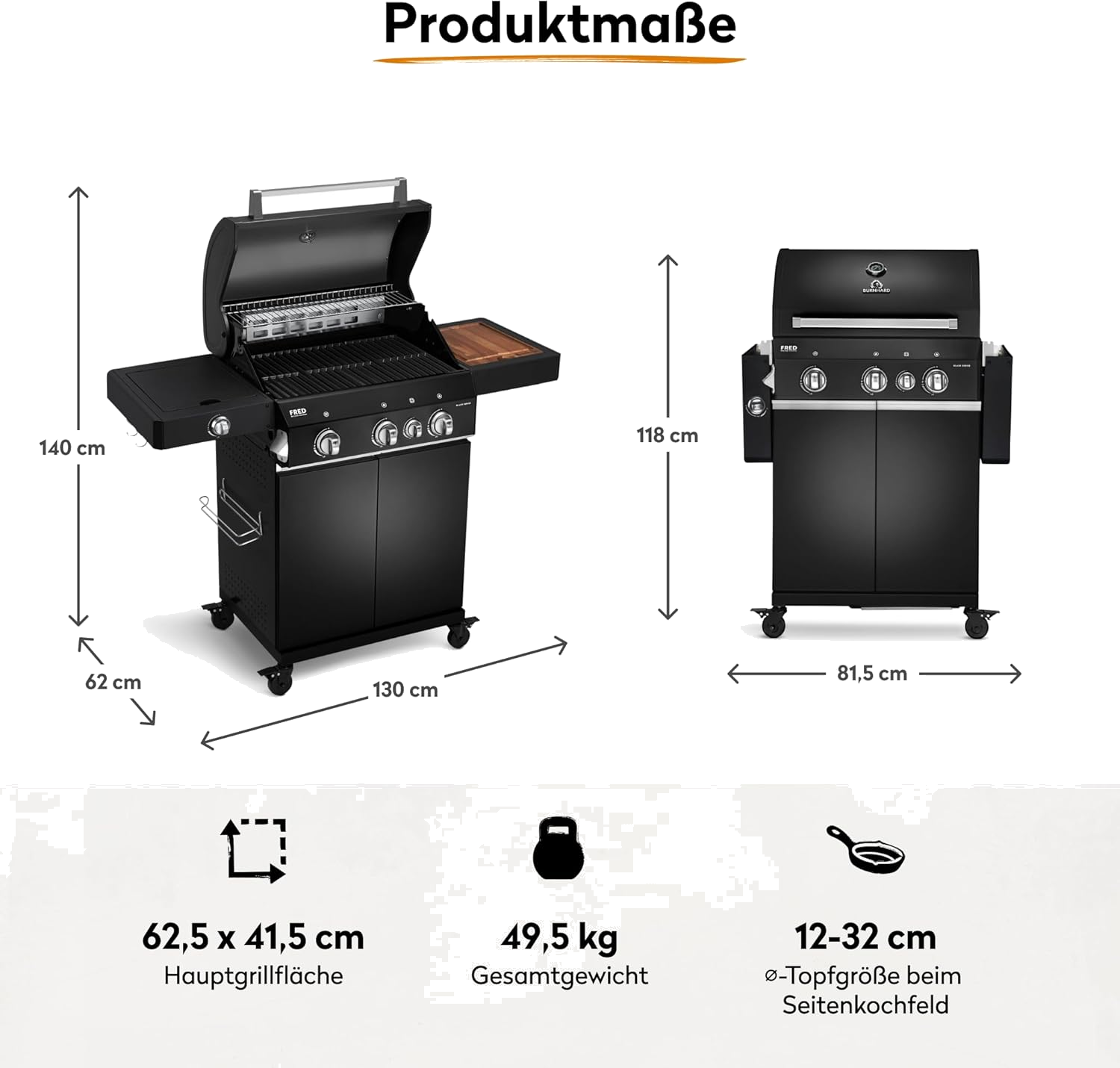 BURNHARD® Gasgrill 3-Brenner inkl. BACKBURNER, 900°C Infrarot-Keramikbrenner, Seitenkochfeld, Gusseisen-Grillrost, Grillabdeckung, klappbare Seitentische, Schwarz – FRED Deluxe – Series 3