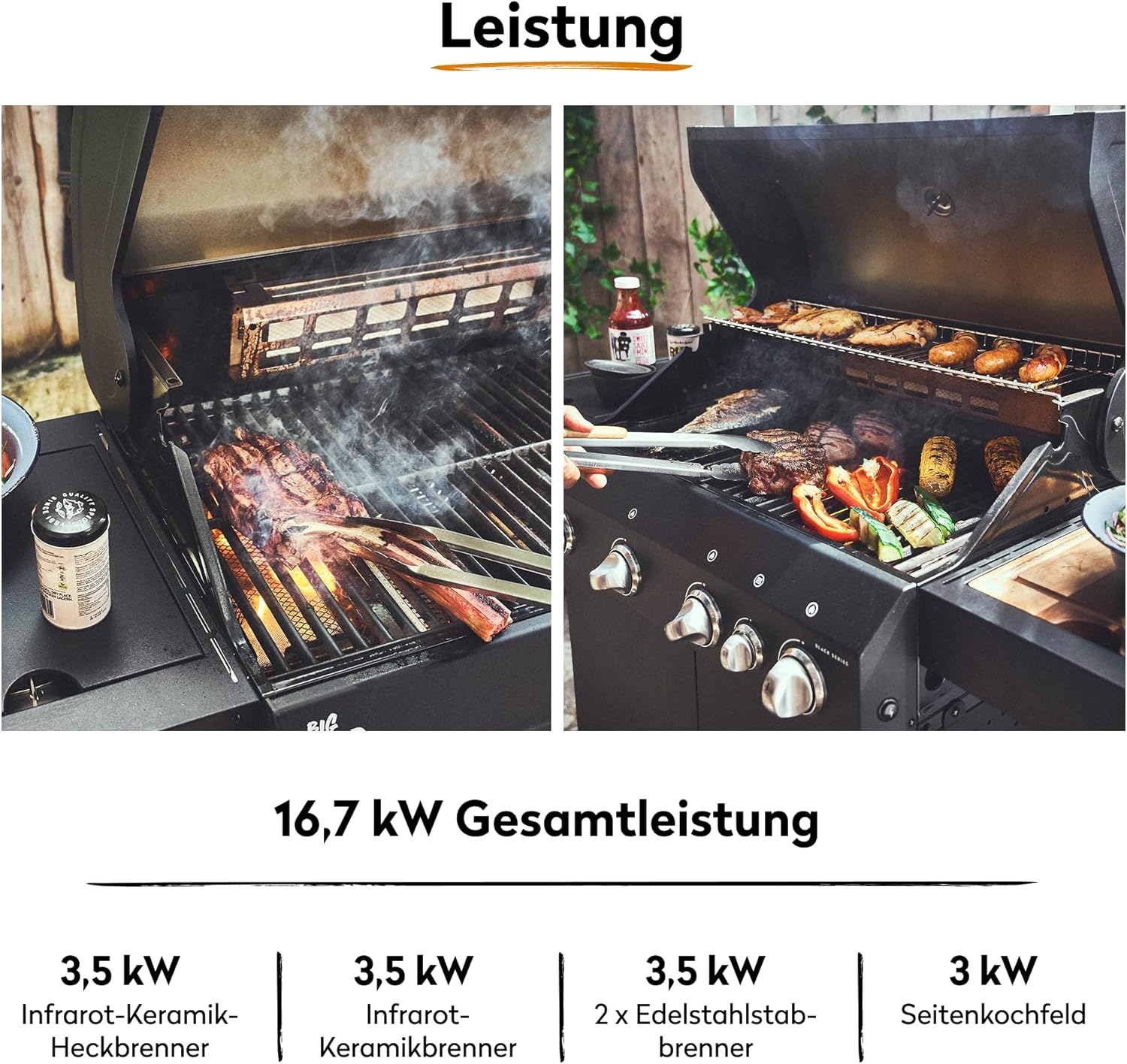 - MAXIMALE BBQ POWER - Infrarot-Heckbrenner, innenliegender 900°C Keramikbrenner, 2 stufenlos regulierbare Edelstahl-Stabbrenner & Seitenkochfeld