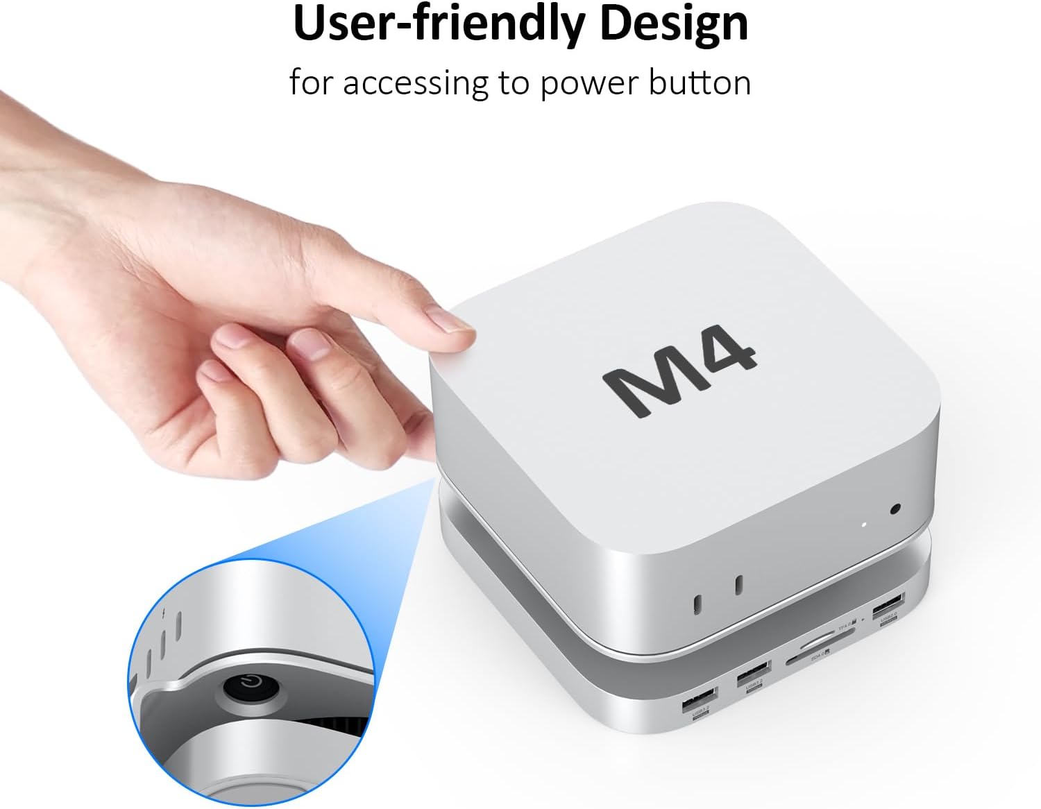- Mac Mini M4 Hub und Ständer in einem Design: Diese Mac-Mini-Dockingstation verfügt über dreifache USB-A-Anschlüsse, M.2 NVMe SSD-Gehäuse und SD4.0/TF4.0-Kartenleser, die speziell für Mac Mini M4 und M4 Pro entwickelt wurden. Kombiniert einen eleganten Ständer und einen Multi-Port-Hub, um die Funktionalität Ihres neuen Mac Mini 2024 zu verbessern und gleichzeitig Ihren Schreibtisch organisiert zu halten.