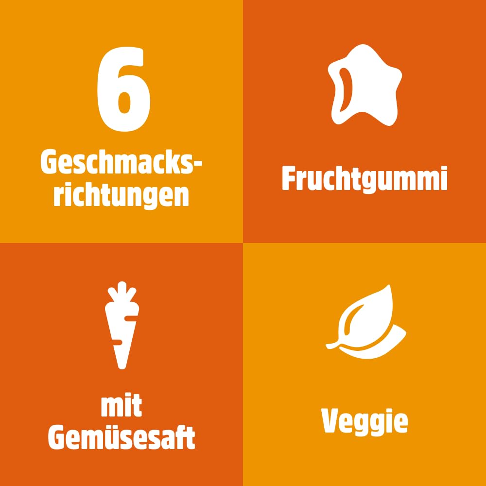 - Gemüse trifft Frucht: Himbeere-Karotte, Blaubeere-Karotte, Zitrone-Karotte, Birne-Karotte, Orange-Karotte und Pfirsich-Maracuja-Karotte – Das Fruchtgummi überzeugt in 6 Sorten