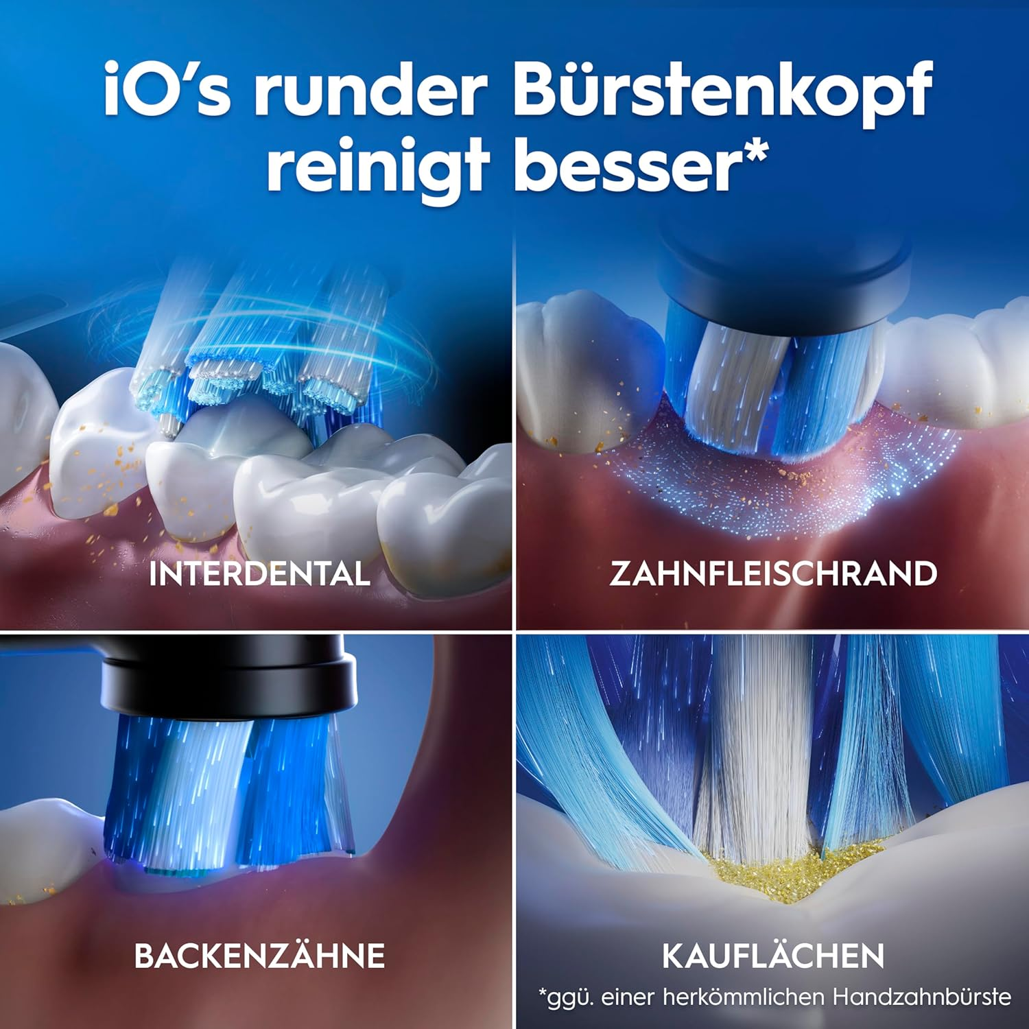 - Für WEISSERE ZÄHNE ab dem 1. Tag mit dem VON ZAHNÄRZT/INNEN INSPIRIERTEN RUNDEN iO BÜRSTENKOPF durch das Entfernen von Oberflächenverfärbungen