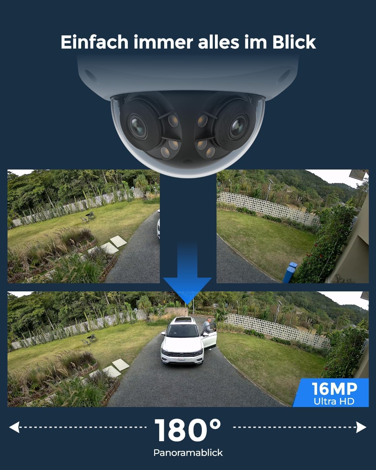 - ULTRA-HOCHAUFLÖSUNG & DUAL-OBJEKTIV: Erleben Sie kristallklare Bilder mit atemberaubender 16MP-Klarheit und einem ultraweiten 180°-Sichtfeld mit dem Dual-Objektiv, das jedes Detail aus jedem Winkel erfassen kann. Durch die Kombination von zwei Objektiven in einem Gerät spart dieses Gerät Installationskosten und bietet gleichzeitig eine doppelte Abdeckung.