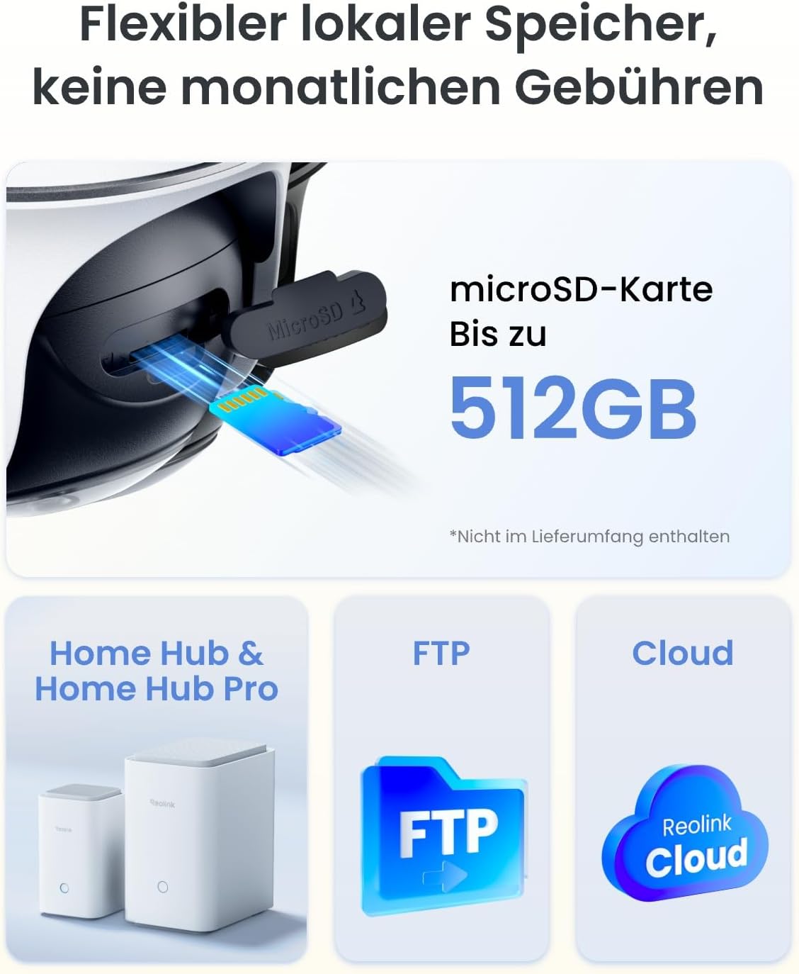 | Speicheroption | microSD-Karte, Cloud-Speicher (Abo nötig) |