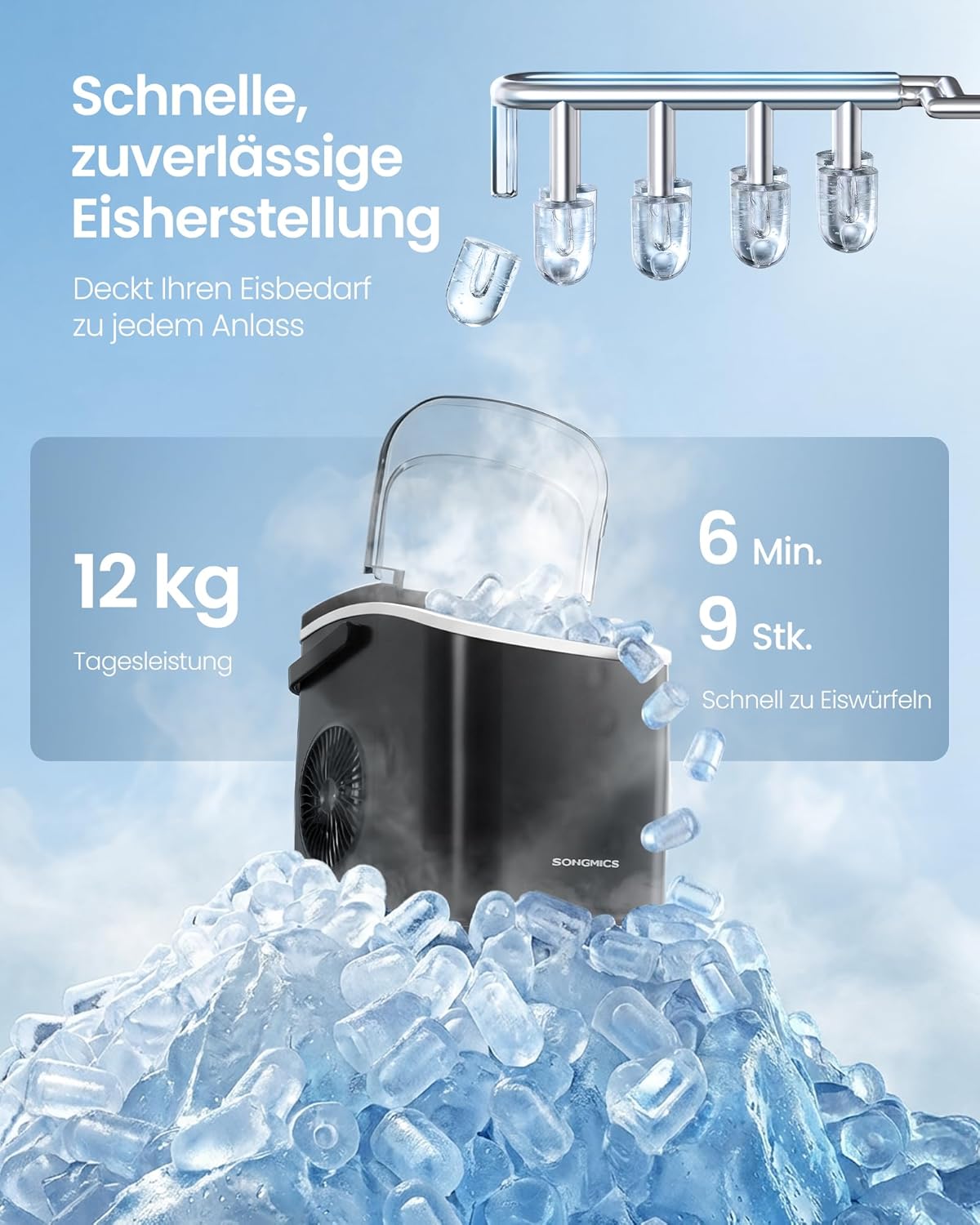 - Schnelle Eiswürfel, wenn Sie sie brauchen: Die kleine Eiswürfelmaschine produziert in 6 Minuten 9 frische Würfel. Bis zu 12 kg Eis in 24 Stunden, Korbvolumen 0,6 kg – damit sind Hausbar, Grillabende, Büro, Partys und Familienfeiern zuverlässig versorgt