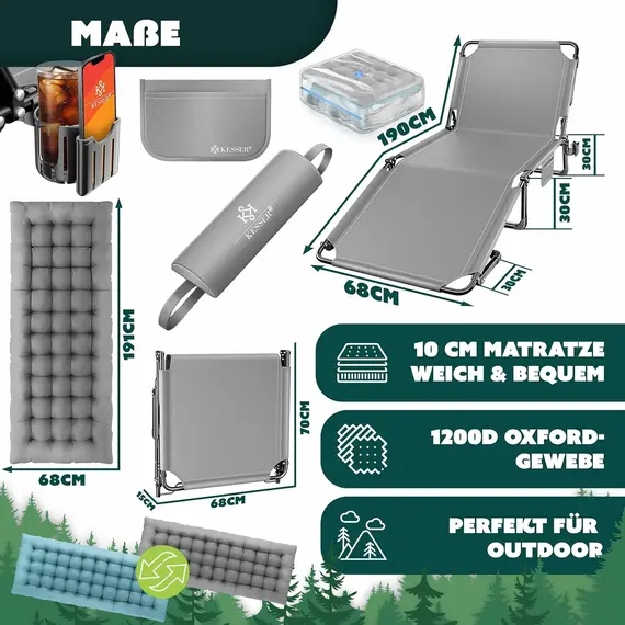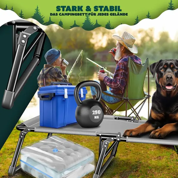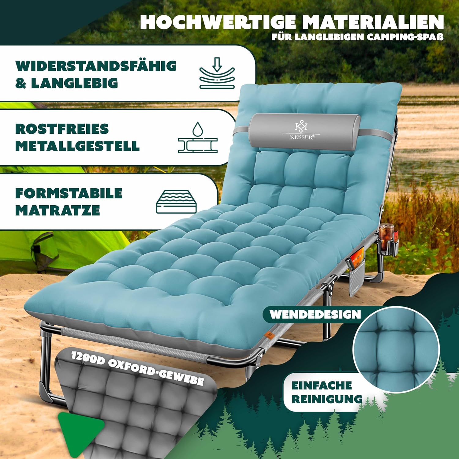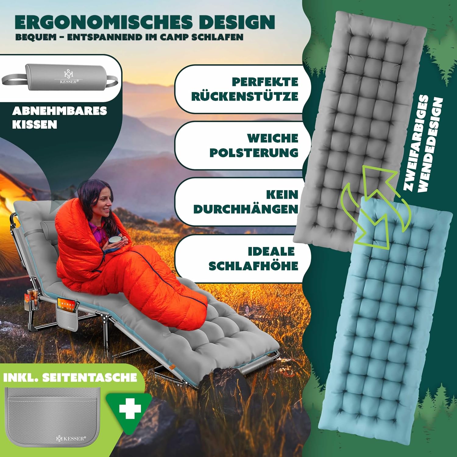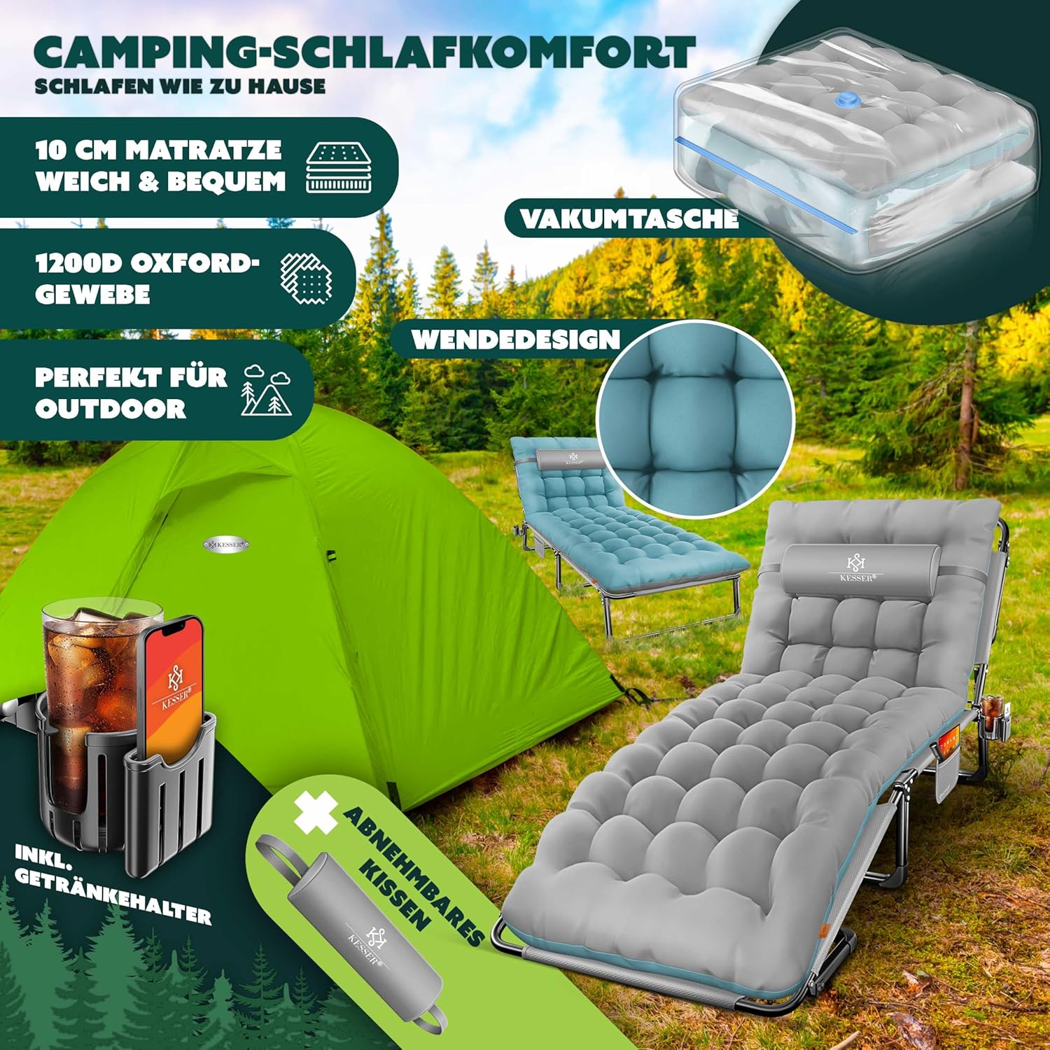Campingbett klappbar mit Seitentasche & Nackenkissen bis 280 kg | Campingliege Sonnenliege mit Polster | Feldbett Outdoor & Indoor | Klappbett Gästebett faltbar Garten Camping Festival Reise